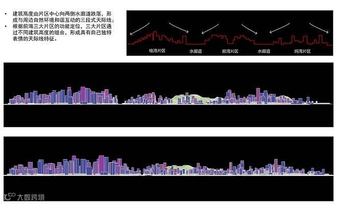 在建筑特色上,建筑高度由片区中心向两侧水廊道跌落,根据前海三大片区的功能定位,三大片区通过不同建筑高度的组合,将形成具有自己独特表情的天际线特征。“构成前海天际线的建筑单体设计要体现地域性、文化性、时代性的和谐统一,形成由以现代主义为主的多元建筑风格组成的天际线。”