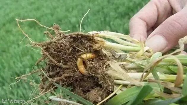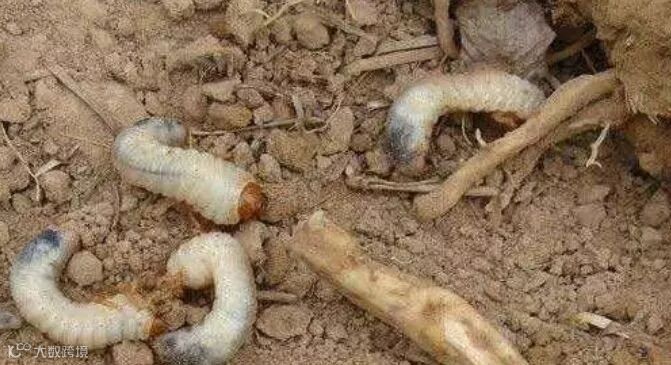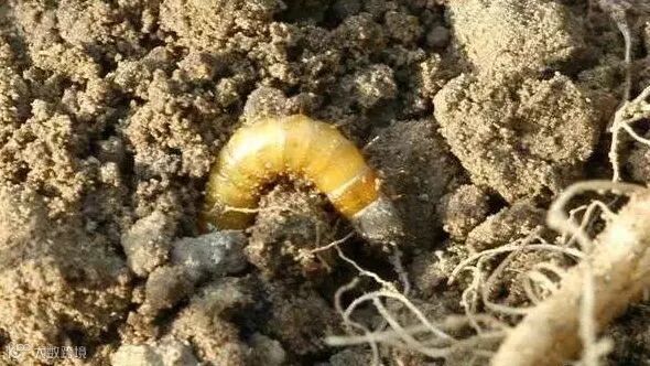 蛴螬是金龟子幼虫,取食小麦幼根、茎白、地下部分,常咬伤或咬断,危害特点:断口较整齐,使幼苗枯萎死亡。