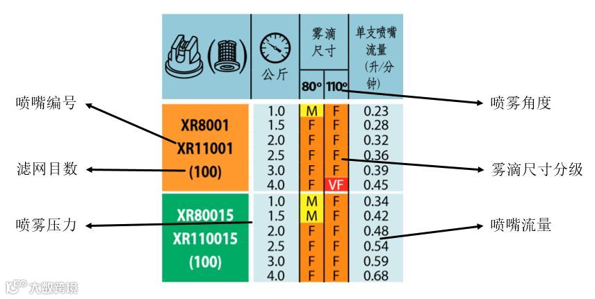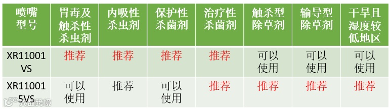 在新疆、甘肃等降水量较少,湿度较低的区域,建议使用 XR110015VS 喷嘴。不仅可支持更大亩用量,产生更大粒径的雾滴,还能减少飘移与蒸发影响。除草剂建议统一使用 XR110015VS 喷嘴,以产生更大粒径的雾滴,减小雾滴飘移产生的飘移药害风险。