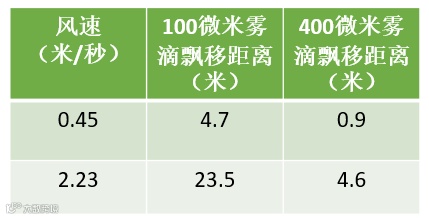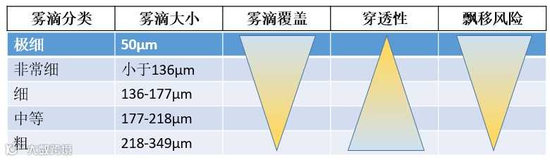 但是,雾滴越细也就更容易产生飘移与蒸发问题,研究发现,100μm 的雾滴在 25℃、相对湿度 30% 的状况下,移动 75cm 后,直径会减少一半④。