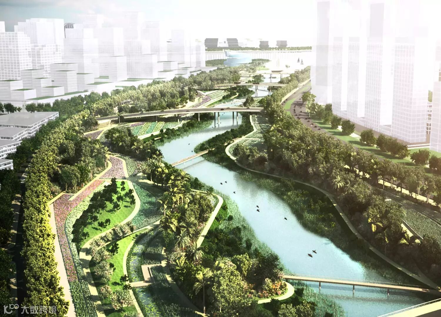 景观都市主义理念与前海实践相结合,建立一套从思想理念到空间格局到实施的“大景观”体系,实现景观、生态、城市共融,将城市生态系统与自然生态系统连成体系。