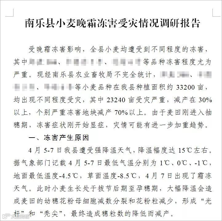 河南南乐县:受晚霜冻害影响,全县小麦均遭受到不同程度的冻害,其中***、***、***等品种冻害程度尤为严重。现经南乐县农业畜牧局不完全统计,***、***、***等小麦品种在我县种植面积约33200亩,均出现不同程度受灾,其中23240亩受灾严重,减产在30%以上,个别严重冻害地块减产70%以上。