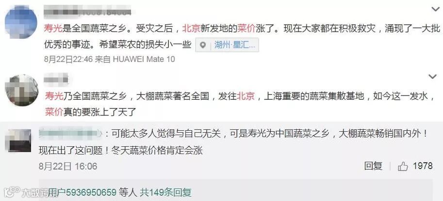 有网友说这与寿光发大水有关。最近,寿光市受台风影响出现大到暴雨,多个村庄被淹,农田、蔬菜大棚损失惨重,菜价也随即上涨。