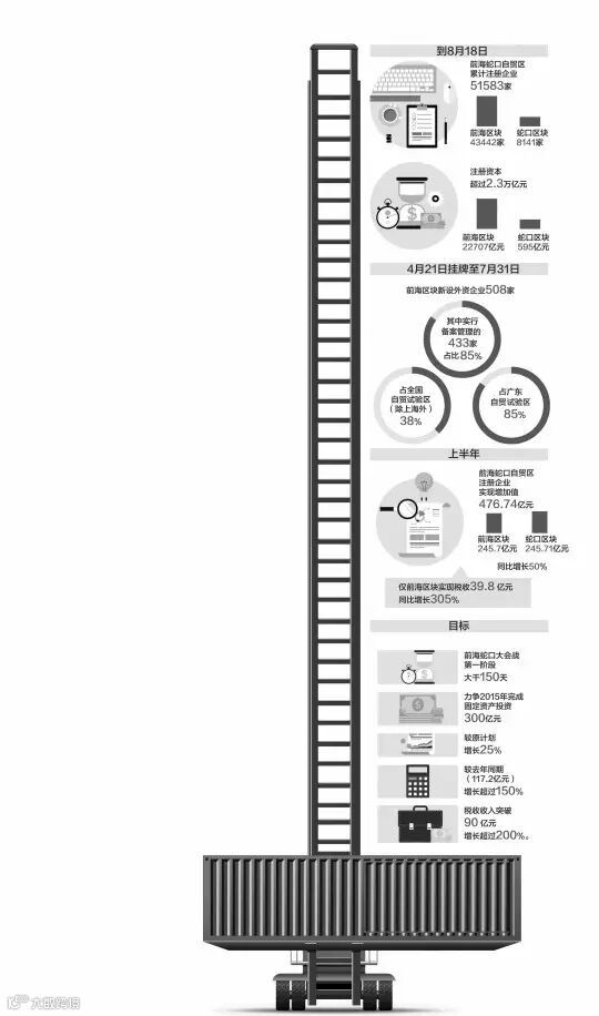 不久前,前海蛇口自贸区掀起了前海蛇口大会战,第一阶段将大干150天。对此,深圳市委常委、广东自贸区前海蛇口片区管委会主任田夫表示,自贸区将力争在2015年完成固定资产投资300亿元,较原计划增长25%,较去年同期(117.2亿元)增长超过150%,税收收入突破90亿元,增长超过200%。