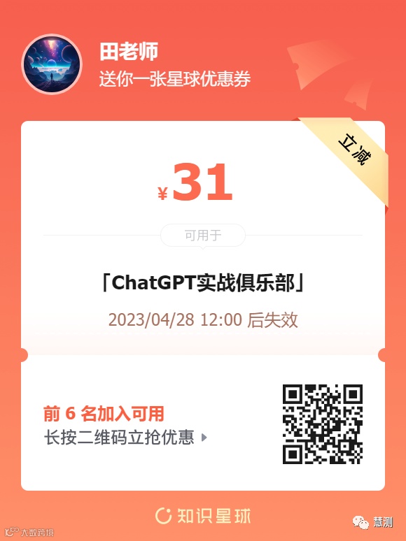自从星球学员熟练了ChatGPT平台和应用,不仅10倍提升工作效率,并且70%的技术难题都可以自行解决了。它的价值你还体会不到吗?今天再送出6张星球优惠券吧!(加星球送官方独享账号活动也即将结束)