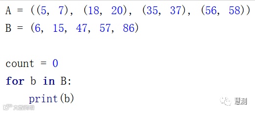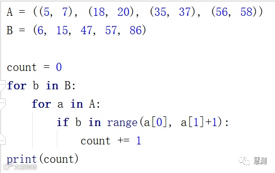 要求你用Python代码统计元组B中的数字落入A中区间的个数。元组B (6, 15, 47, 57, 86)。