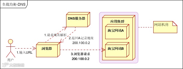 将DNS作为第一级负载均衡,A记录对应着内部负载均衡的IP地址,通过内部负载均衡将请求分发到真实的Web服务器上。一般用于互联网公司,复杂的业务系统不合适使用。如下图: