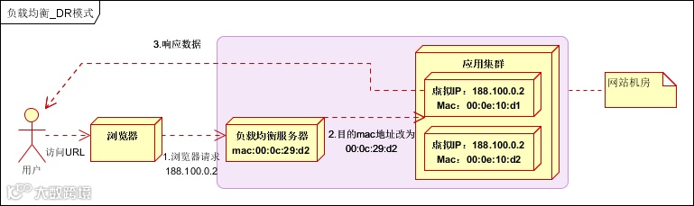 数据分发时,不修改ip地址,指修改目标mac地址,配置真实物理服务器集群所有机器虚拟ip和负载均衡服务器ip地址一致,达到不修改数据包的源地址和目标地址,进行数据分发的目的。