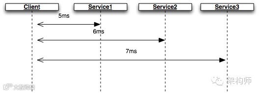 大部分耗时长的服务主要时间都花在中间两个环节,即获取数据和处理数据环节。对于非计算密集性的系统,主要耗时都用在获取数据上面。获取数据主要有三个来源:本地缓存,远程缓存或者数据库,远程服务。三者之中,进行远程数据库访问或远程服务调用相对耗时较长,特别是对于需要进行多次远程调用的系统,串行调用所带来的累加效应会极大地延长单次请求响应时间,这就增大了系统进入长请求拥塞反模式的概率。如果能够对不同的业务请求并行处理,请求总耗时就会大大降低。例如下图中,Client需要对三个服务进行调用,如果采用顺序调用模式,系统的响应时间为18ms,而采用并行调用只需要7ms。