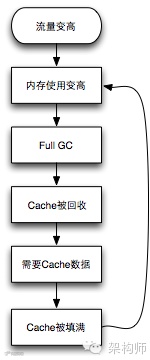 为了降低响应时间,系统往往在本地内存中缓存很多数据。缓存数据越多,命中率就越高,平均响应时间就越快。为了降低平均响应时间,有些开发者会不加限制地缓存各种数据,在正常流量情况下,系统响应时间和吞吐量都有很大改进。但是当流量高峰来临时,系统内存使用开始增多,触发了JVM进行full GC,进而导致大量缓存被释放(因为主流Java内存缓存都采用SoftReference和WeakReference所导致的),而大量请求又使得缓存被迅速填满,这就是反复缓存。反复缓存导致了频繁的full GC,而频繁full GC往往会导致系统性能急剧恶化。典型恶化流程图如下图: