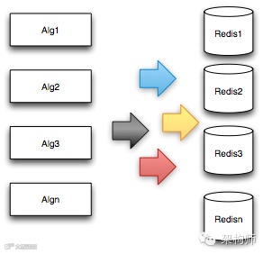 通常而言,客户端每个用户请求都会触发多个算法。一方面,每个算法都会召回几十甚至几百个团购或者商家ID,团购和商家基础属性被均匀地分配到几十台Redis里面(如下图),产生了大量的Redis请求,极端情况下,一次客户端请求所触发的团购基础数据请求就超过了上千次;另一方面,用户特征属性信息有十几种,每种属性也由单独的服务提供,服务端网络调用次数暴增。在一段时间里,很多系统都进入了多次请求杠杆反模式,Redis服务器的网卡经常被打死,多次进行扩容,提高线程池线程数量,丝毫没有改善。