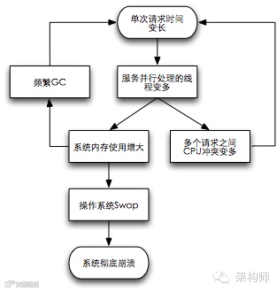 这是一种单次请求时延变长而导致系统性能恶化甚至崩溃的恶化模式。对于多线程服务,大量请求时间变长会使线程堆积、内存使用增加,最终可能会通过如下三种方式之一恶化系统性能: