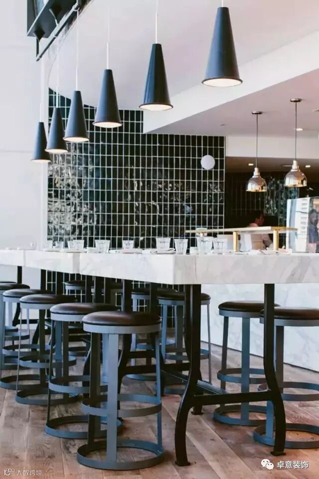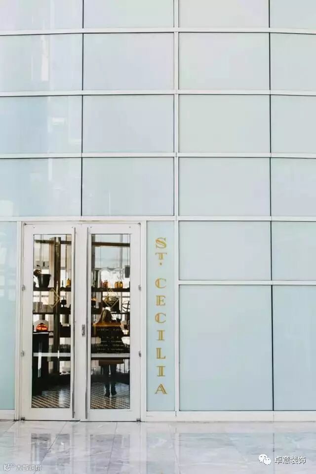 St. Cecilia Bistro吧台处白色台面与黑色高脚椅相得益彰格子酒架井然有序。