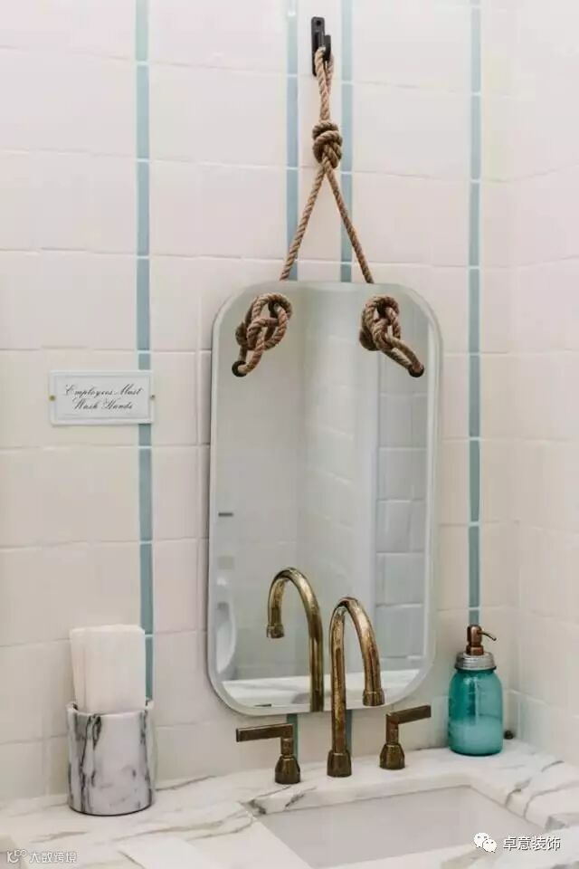 在洗手间将细麻绳与旧铜色水龙头结合在一起