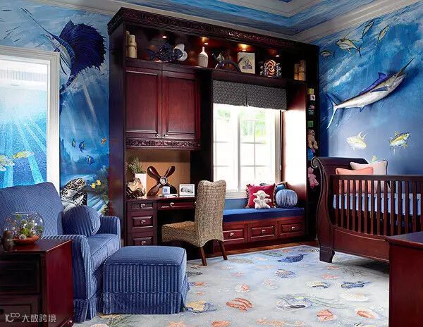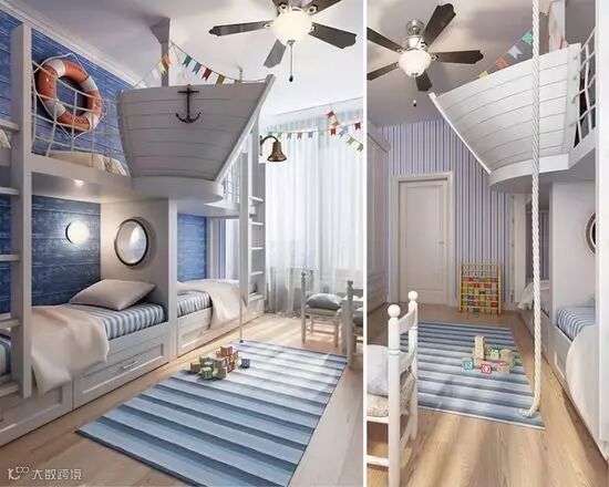 大海充满了变数与未知,令孩子有着向往的感觉,相比普通的白墙木床,用蓝色系、帆船、救生圈、冲浪板打造一个大海感觉的卧室,让孩子何时都能在家感受大海的美丽和畅快,是不是更有意思?
