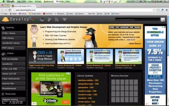 DevelopPHP.com 是一个快发展中的教育系统,这里有大量的视频和文字资料,可供你在任何时候获取,并且100%免费。在这里,2013年受关注的五大技术是:HTML,CSS,JavaScript,PHP和MySQL。来这里学习编程理论,数据库交互,网页设计,动画,图形编辑,矢量艺术,三维建模,等等。