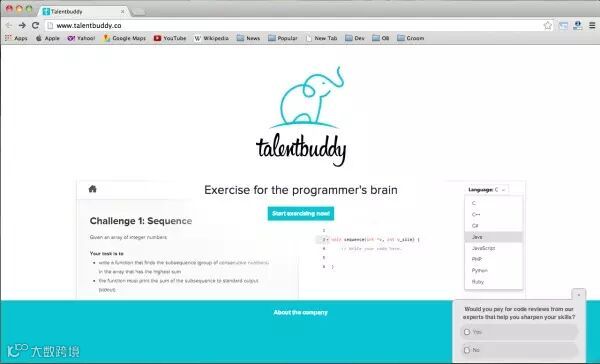 TalentBuddy为程序员提供了一个可以练习C、C#、C++、javascript、PHP、Python, Ruby的地方,以采访问答的方式引导你解决问题。