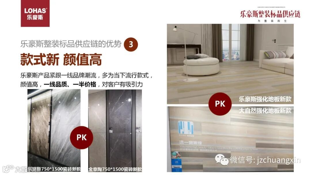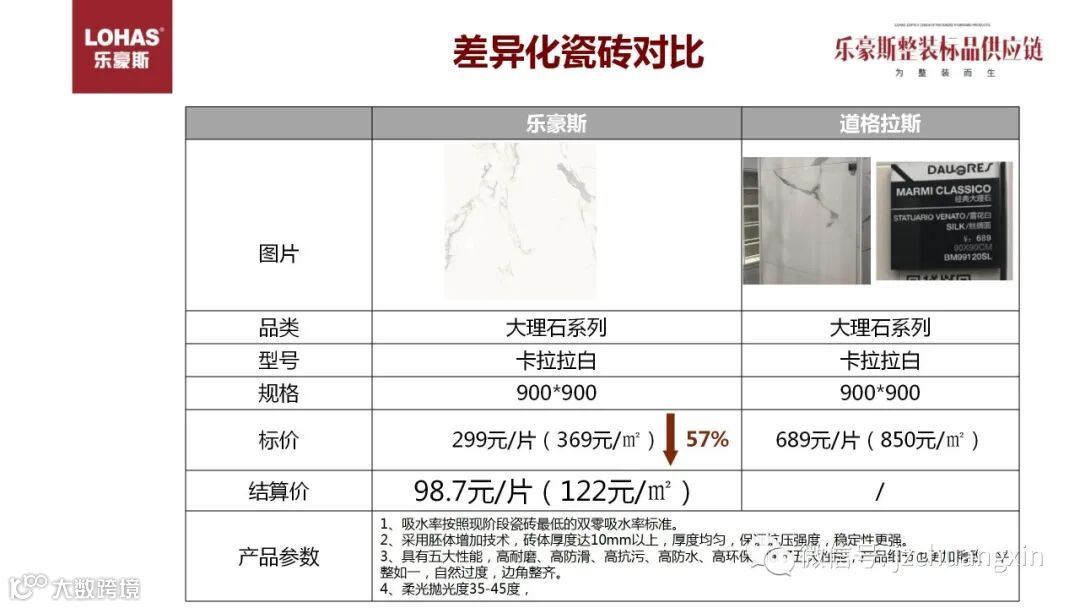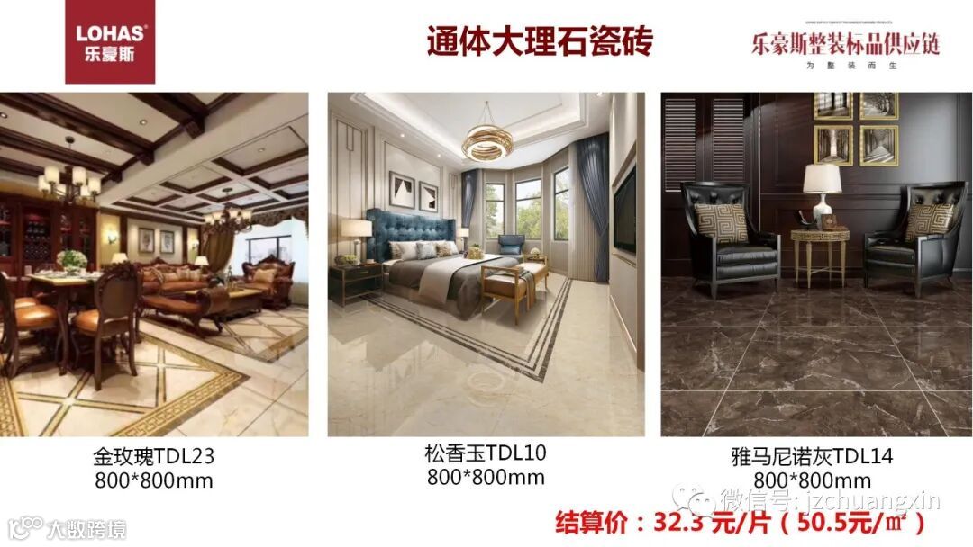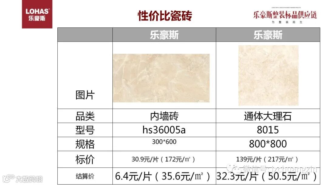 刚才属于性价比产品,同样的品质价格要低得多,同样的我们也有差异化的产品,大牌厂商当季最新,最流行的花色,在一般整装公司是看不到的,而乐豪斯也是拥有的。以水墨山河瓷砖为例,都是当季最流行的款式,产品标价只有其他品牌厂商的一半。结算价更低,利润空间非常大。
