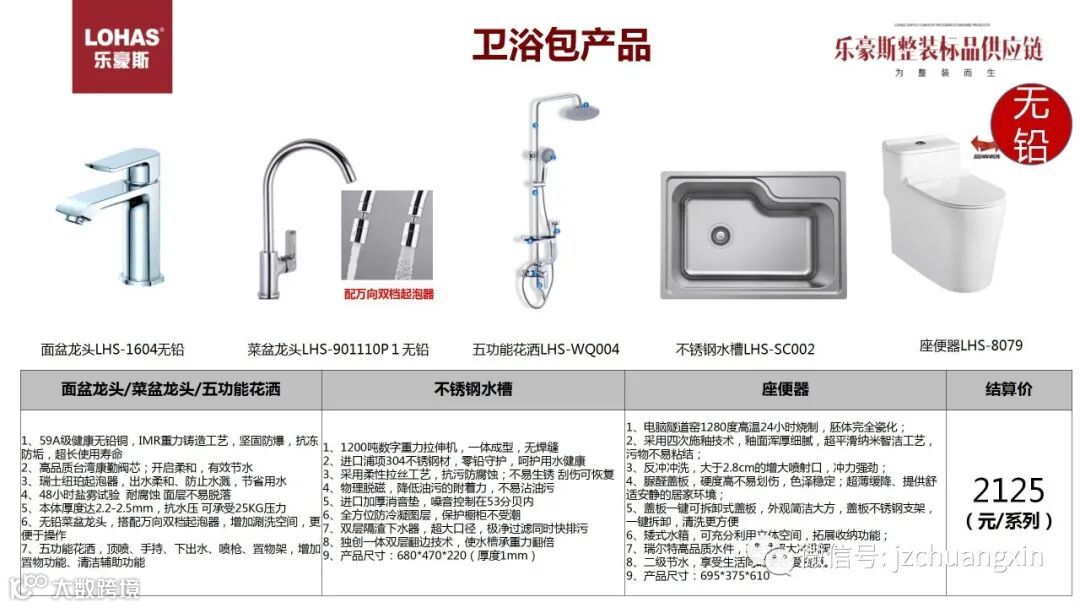 包含无铅面盆龙头、无铅配万向双档起泡器菜盆龙头、五功能花洒、不锈钢水槽、座便器,整套高品质卫浴包只需要2125元。