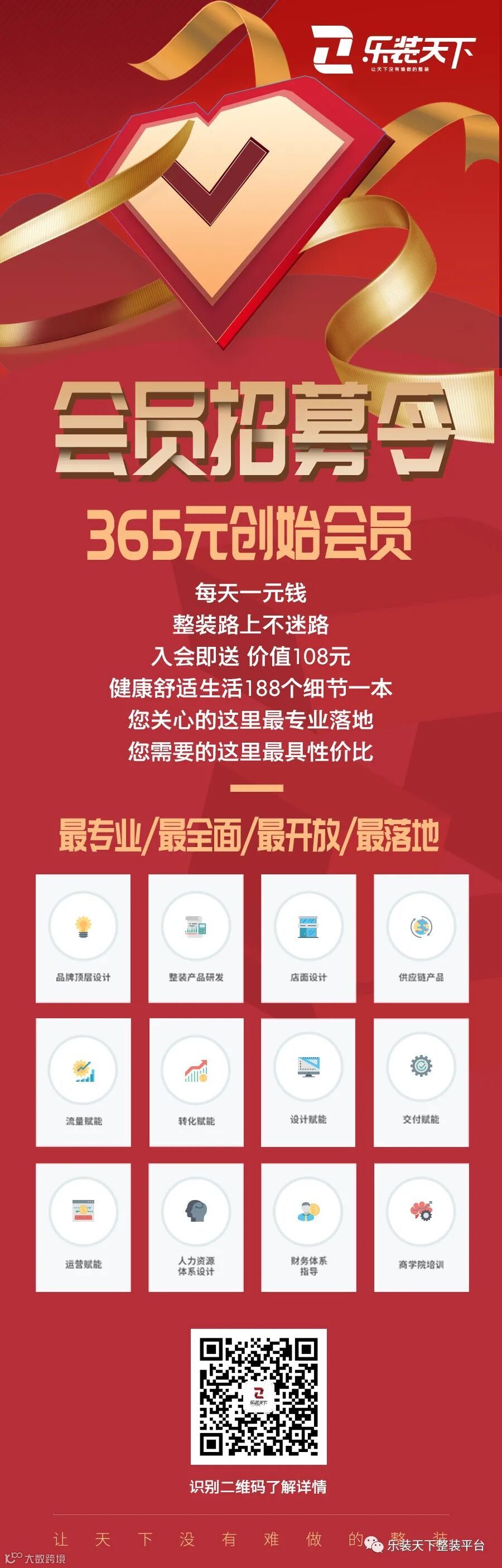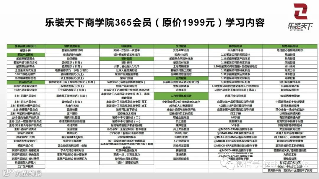 乐装天下商学院招募会员,原价1999元现在只需365元,一天1块钱即可享受全体系整装课程,包含整装品牌顶层设计、整装产品研发、店面设计、供应链产品、销售管理赋能、转化赋能、设计赋能、交付赋能、运营赋能、人力资源体系设计、财务体系指导以及商学院培