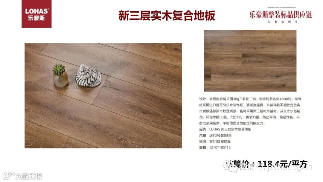今年我们还推出新三层实木复合地板,是今年最为流行的一种品类,三层实木基材,进口西班牙拉米装饰纸、耐磨层采用38g三氧化二铝,外观逼真的同时脚感舒适,健康环保,结算价118.4元/㎡,远低市场价平均300元/㎡左右。