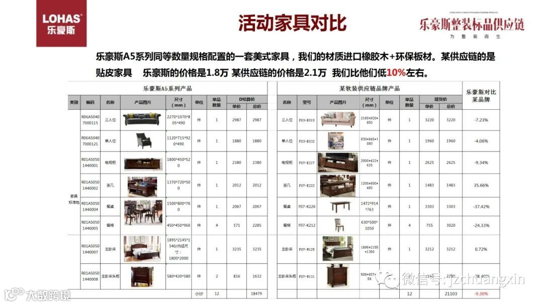 乐豪斯与多家工厂合作,像A5系列同等数量规格配置的一套美式家具,我们的材质进口橡胶木+环保板材。某供应链的是贴皮家具。乐豪斯的价格是1.8万某供应链的价格是2.1万 我们比他们低10%左右。