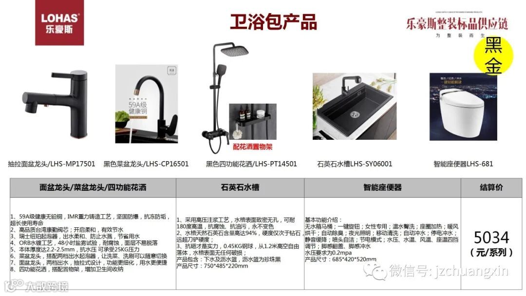 包含抽拉面盆龙头、黑色菜盆龙头、黑色四功能花洒、石英石水槽、智能座便器,单品价格市场就要5000以上,但是在乐豪斯整套产品包只需5034元。