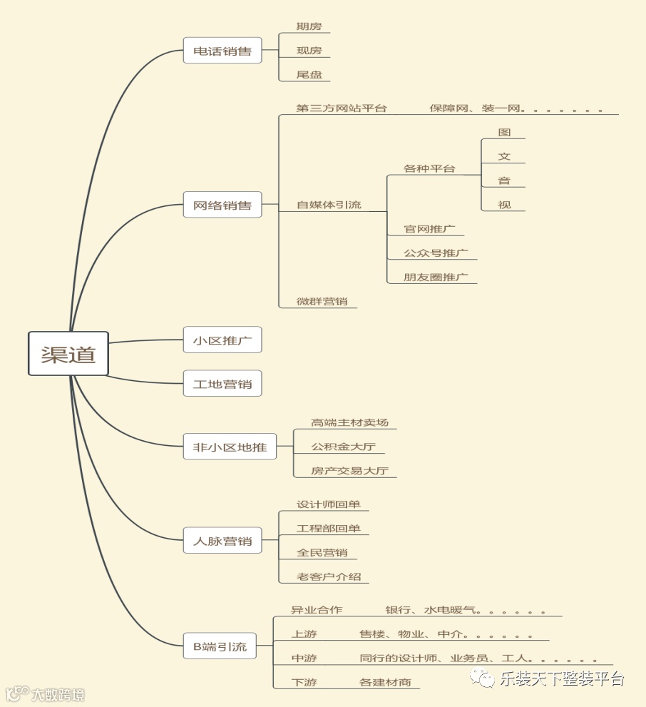 “我们的客户在什么地方?经常出没在哪里?怎么样才能接触到我们的目标客户?”这是大家一直都在讨论的问题,您的公司是否到店渠道单一,造成流量不稳定,乐装天下整装商学院拥有最全面的获客渠道划分,给大家分享一个思维导图: