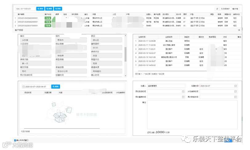 每一次的沟通都会做一个详细的记录,但时间久后,对于手里意向客户、到店客户多了以后,就会造成回访跟踪不及时,小条本丢失等等一系列的问题,那么我们乐装天下全面升级为线上系统“CRM”:
