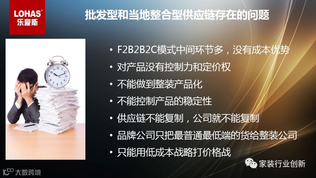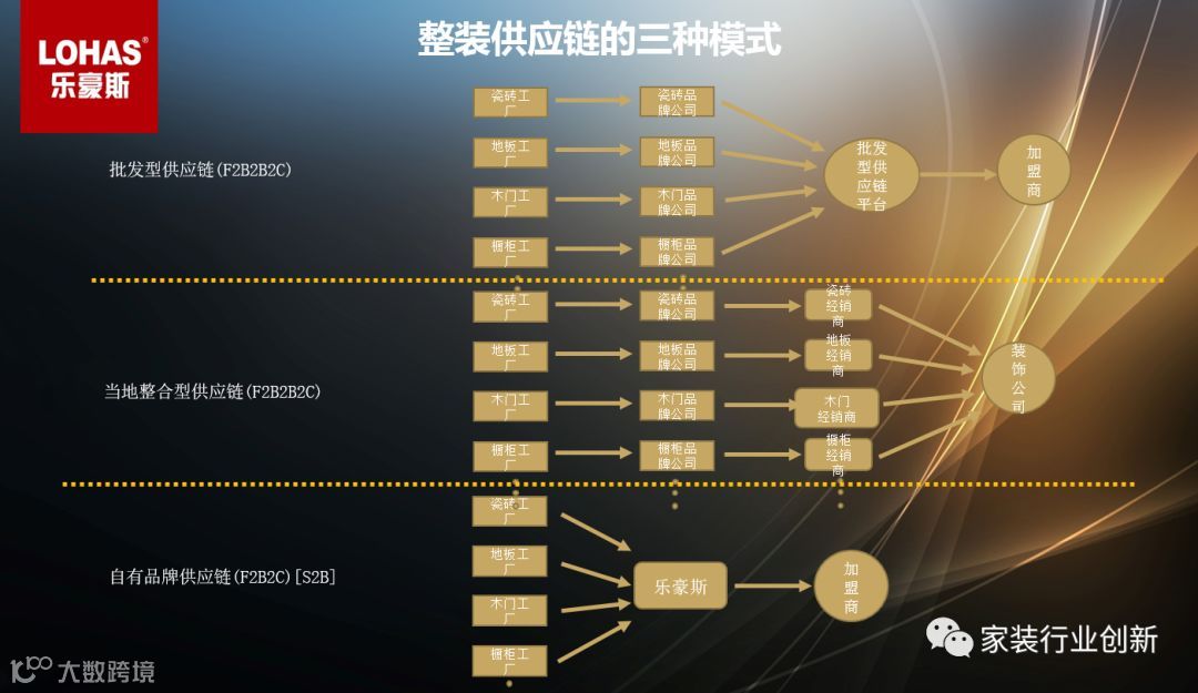 做整装最核心的是选择供应链模式,供应链模式几乎决定了整装的商业模式,目前90%的公司都选择自己在当地整合供应链,这种模式供应链链条过长,做整装只能靠拼凑,客户价值低下。另一种是加入批发型供应链平台,这是目前加盟连锁家装公司正在做的事。用这种类似团购模式集合全国连锁公司的量级向品牌公司进行采购,获取更低的采购价格。这种模式存在的问题是产品没有控制力和定价权,利润空间有限。另外很多品牌公司不会把最新最好的产品供应给这个渠道,这就很难保证产品的颜值和品质等。我给家装公司的建议是:家装公司慎做供应链;整装链条很长,整装公司+整装供应链公司组合才有未来。乐豪斯是自有品牌供应链平台,是真正的F2C模式,中间环节少,产品性价比高。这种模式有产品控制力和定价权,利润空间高,模式可复制。而且我们的整装产品是经过研发组合好的,匹配度高,颜值高,客户价值较大。