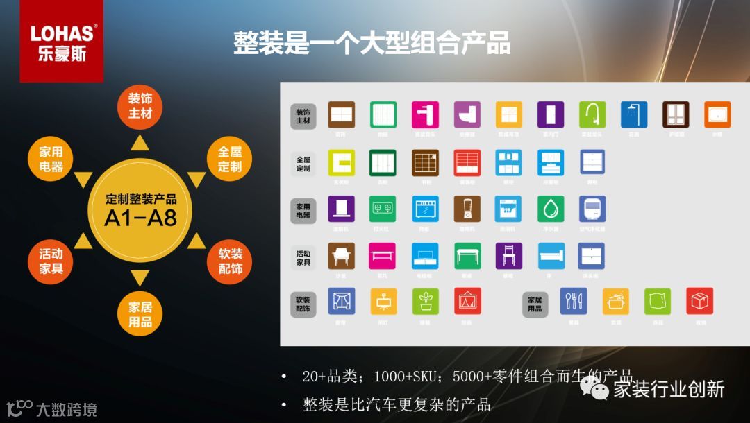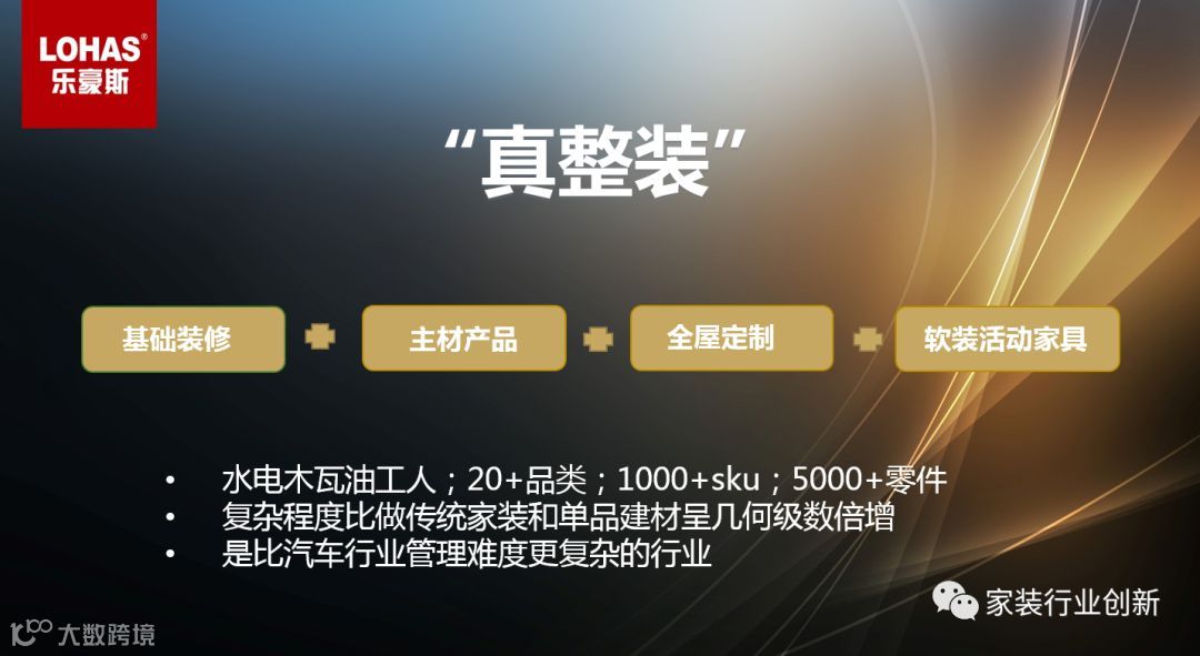 家装和建材原本是两个行业,整装把家装和建材融合在一起。真整装包括基础装修、主材产品、全屋定制、软装活动家具,囊括l水电木瓦工人、20+品类、1000+SKU、5000+零件,复杂程度比作传统家装和单品建材呈几何级数倍增,是比汽车行业管理难度更复杂的行业。