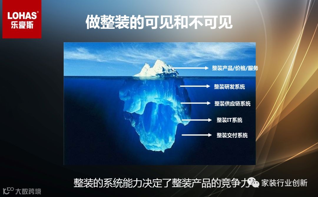 周新说,做整装和做企业一样,分可见和不可见的部分,比如我们说XXX产品套餐是可见的产品呈现给客户,不可见的有供应链体系、IT体系、交付体系等等,所以整装系统能力决定了整装产品的竞争力。你看到的表象的一些东西底下是由系统能力决定的。乐豪斯这几年做整装的经验,我们总结整装需要有五大类系统:研发系统、全品类的供应链系统、IT系统、交付系统、运营系统。