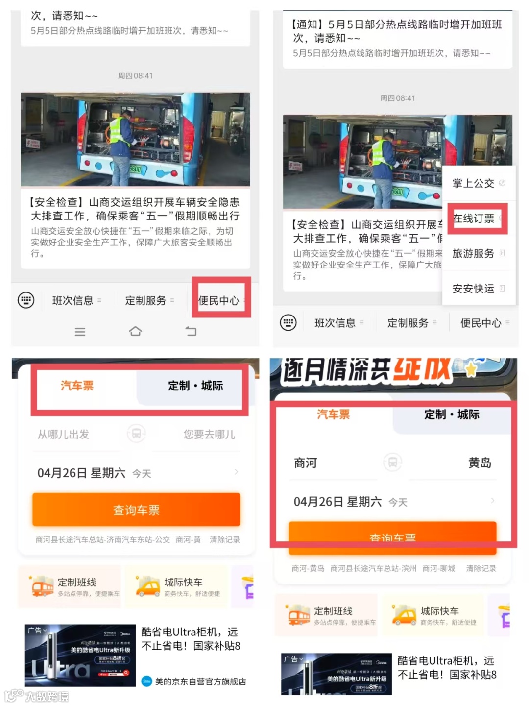 关注“山商交运”&“商河县汽车站”微信公众号点击“便民中心”选择“在线订票”选择“汽车票”或“定制·城际”进入购票系统后根据出行需要选择好出行线路乘车日期和具体出发时间填入乘车人信息支付后即可生成订单。