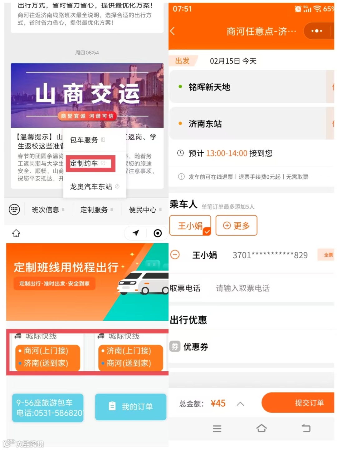 3、根据需求选择从商河→济南或济南→商河城际快线,以(商河→济南定制出行为例)根据提示填入上下车地点、出行时间段、购票人信息、联系电话,信息确认无误后提交订单,出发前等待司机联系即可。