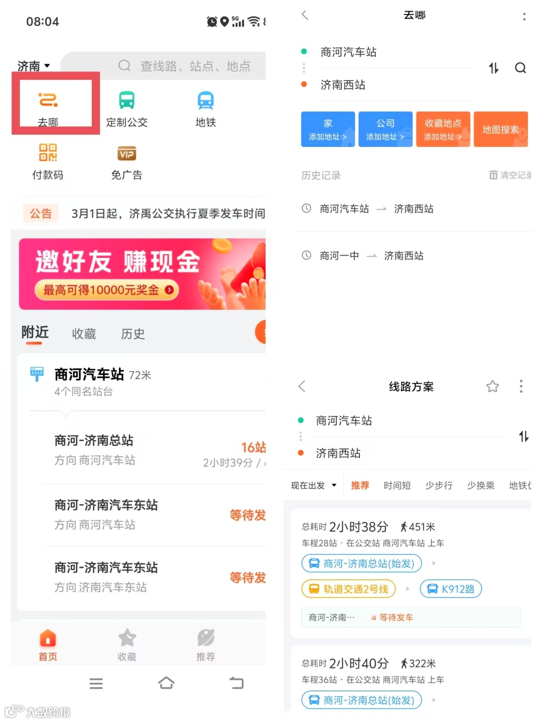 点击菜单“去哪”输入起点和终点后,自动规划最有路线(如换乘最少、时间最短、步行最少)。