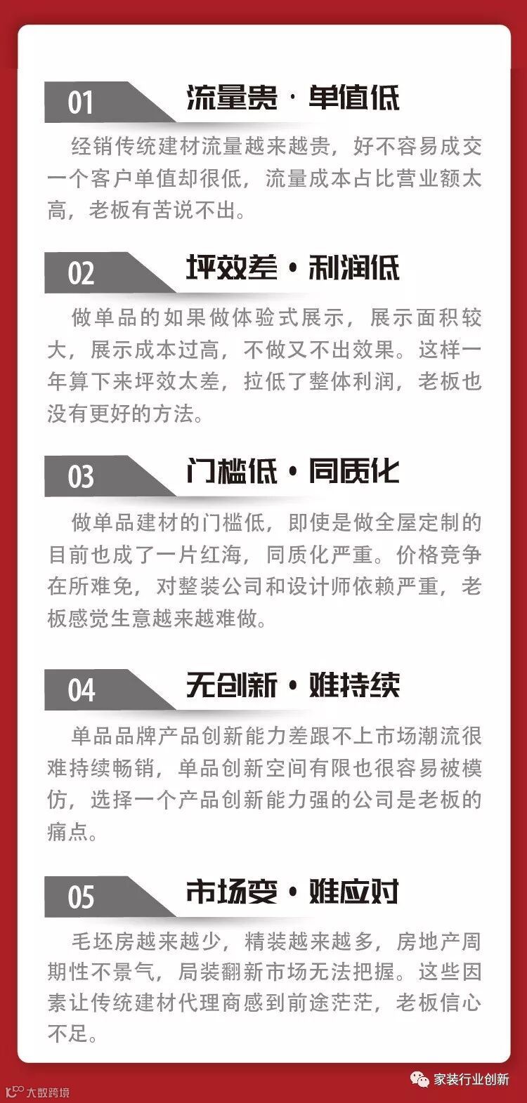 家居行业经销商注定会越来越焦虑!因为家居行业的趋势变了,消费趋势已经从产品出发的单品规模经济变为了从客户出发的整装范围经济,这点在我的第5篇文章里有所论述。(点击查看👉👉老周说整装(五)丨没有全屋定制的整装不是好整装)直接的结果就是做单品的越来越难做,流量越来越贵、坪效越来越低、利润越来越少。更加悲惨的是批量精装已经成为趋势,这对家居行业单品经销商来说无异于火上浇油。
