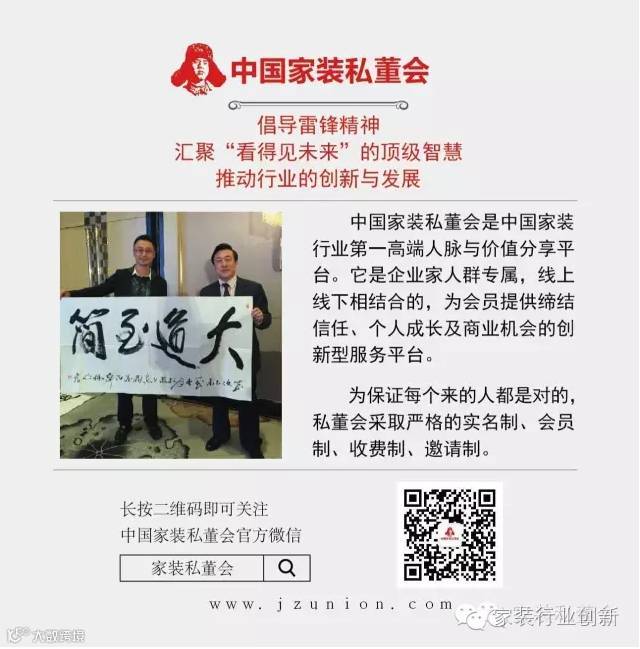 我诚邀更多的家装企业家加入中国家装私董会,一起贡献力量,推动行业发展,致力于让中国装修变得简单平价,造福装修业主。
