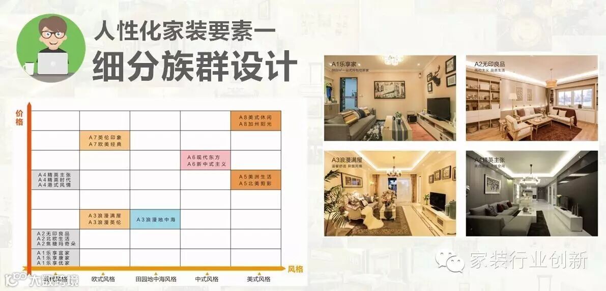 也就是按照客户的喜好、风格、价格对客户进行细分,例如有喜欢宜家的,有喜欢无印良品的、有喜欢浪漫主义的,有喜欢简美的等等。是按族群分类并提供相应产品,因为互联网时代是小众消费的时代,一款套餐打天下的时代即将过去,有关细分族群设计可以查阅我以前的文章了解。