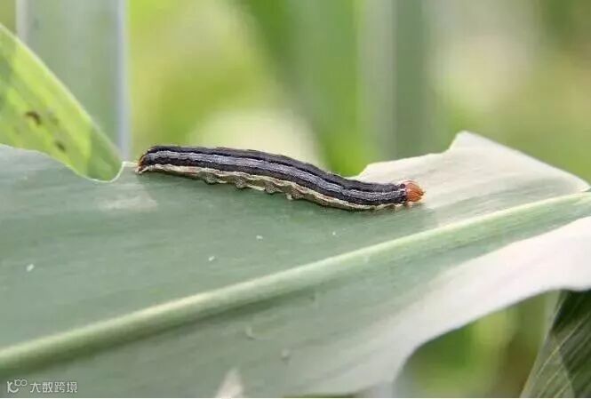 粘虫以幼虫啃食叶片形成危害,老熟幼虫体长36~40mm,头部红褐色,头盖有网纹,额扁,头部有棕黑色“八”字纹。体背有5条不同颜色的线,体色由淡绿至浓黑,常因食料和环境、发生密度不同而有变化。