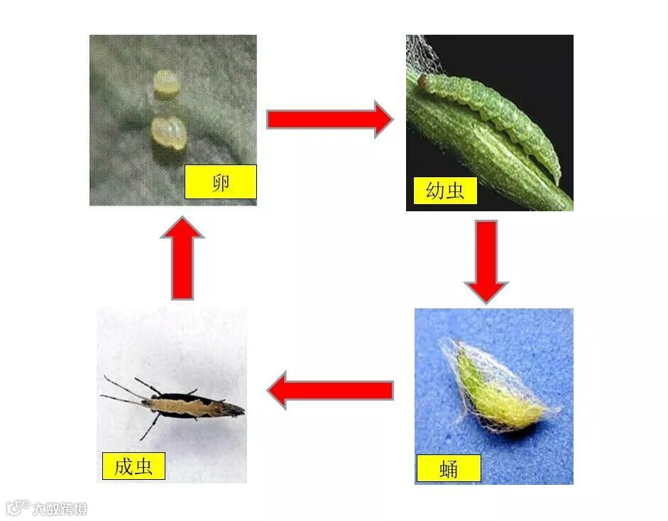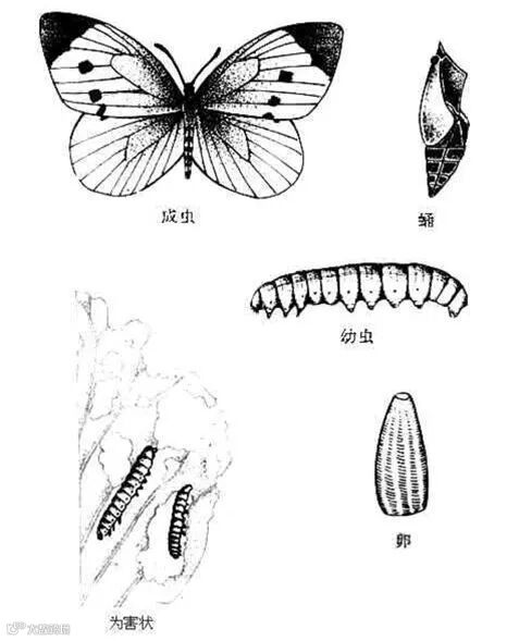 菜青虫一生要经过卵、幼虫、蛹、成虫4个不同的发育阶段。