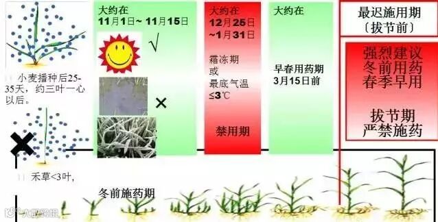 根据麦田杂草的生长发育规律而定,杂草的生育状况、叶龄对除草效果影响很大,杂草叶龄小,抗药性差,吸收药液快,田以杂草出苗90%以上,此时施药效果最好。施药过早,杂草尚未出苗,而施药过晚杂草叶龄偏大,群体过密,杂草长势旺,抗药性强,均达不到防治效果。
