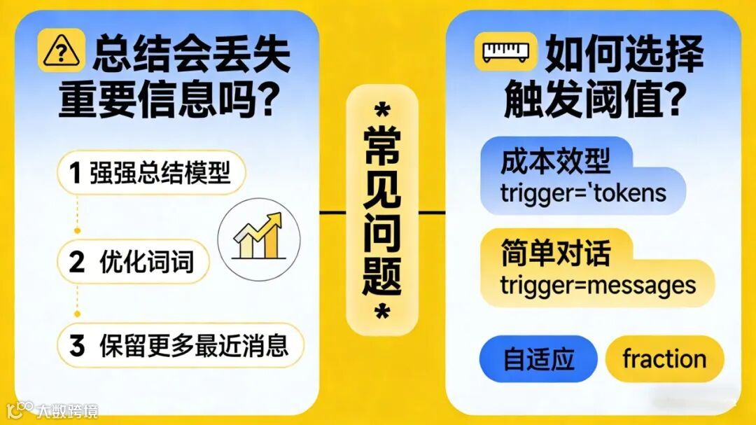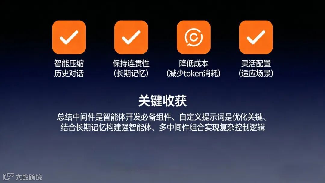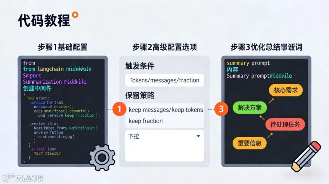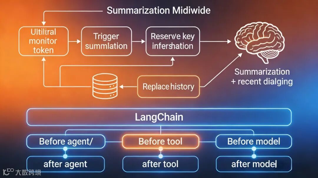 pythonfrom langchain.middleware import SummarizationMiddleware# 创建中间件summarization_middleware = SummarizationMiddleware(llm=ChatOpenAI(model="gpt-4o-mini"), # 总结专用模型trigger="tokens", # 触发条件类型trigger_value=3000, # 3000token时触发keep_messages=5, # 保留最近5条消息)