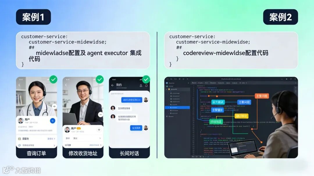 python# 1. 工具定义(MCP服务对接电商系统)tools = [search_products_tool,query_order_status_tool,update_address_tool,create_ticket_tool]# 2. 中间件配置middlewares = [SummarizationMiddleware(...), # 总结中间件LongTermMemoryMiddleware(...), # 长期记忆DynamicPromptMiddleware(...) # 动态提示词]# 3. 智能体执行器agent_executor = AgentExecutor(agent=create_react_agent(llm, tools),tools=tools,middlewares=middlewares,verbose=True)