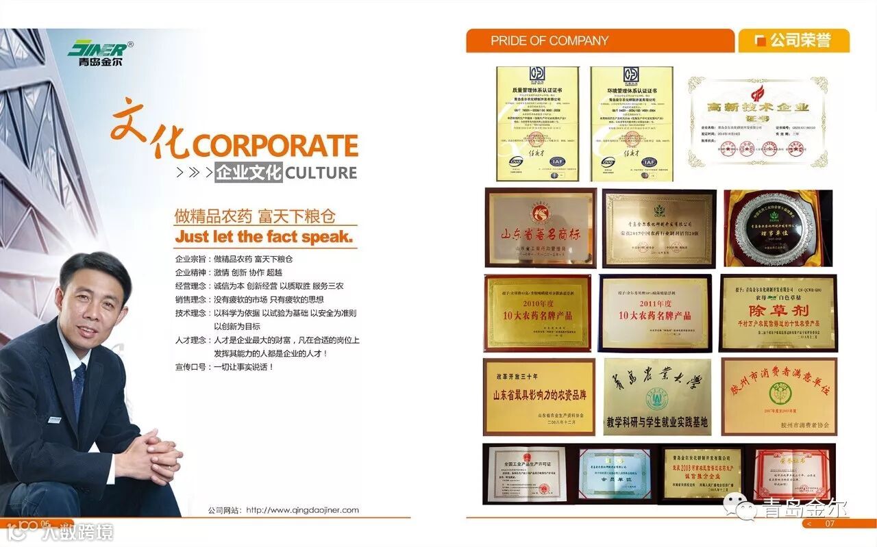 青岛金尔农化是国家农药定点生产企业,专业从事农用化学药剂的研发、生产及销售,产品涵盖农药原药、农药制剂、植保服务等相关领域。通过多年的努力和辛勤耕耘,青岛金尔农化已经赢得了社会各界的广泛认可,迅速成长为国内农药行业的知名品牌。