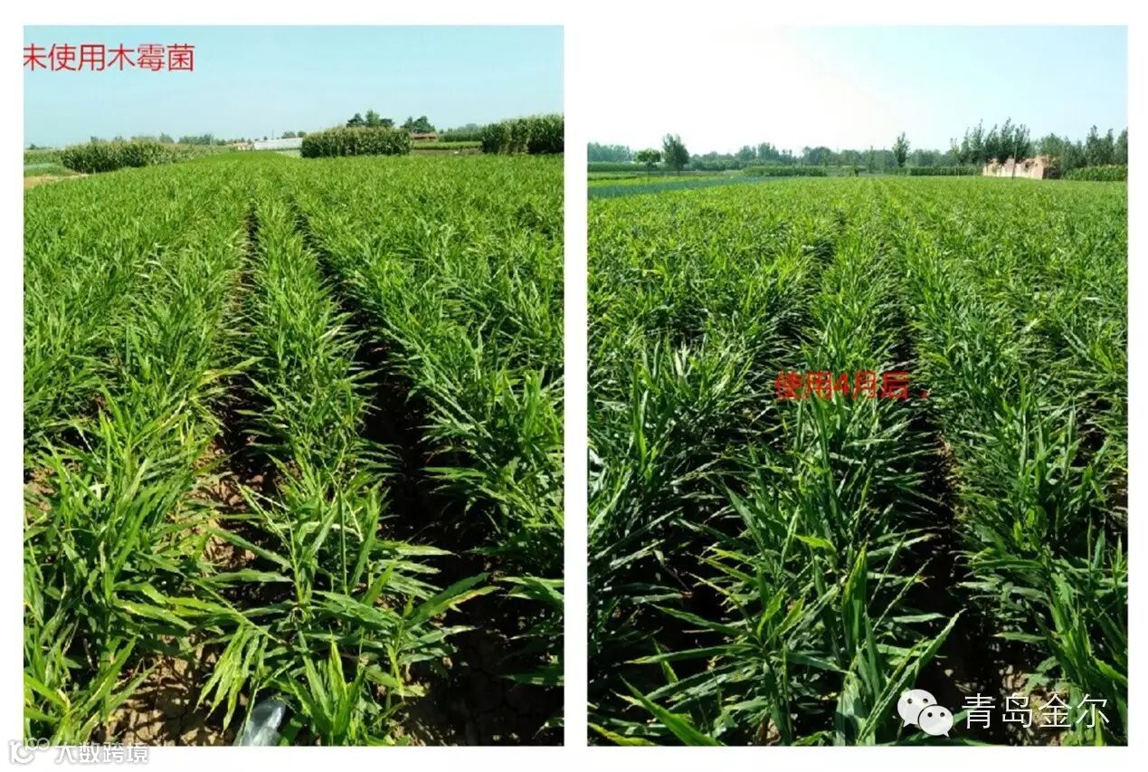 使用观察:2个月后观察,土壤明显疏松,4个月后使用木霉菌的大姜长势更加旺盛,植株粗壮,叶片黑绿。而未使用过木霉菌的大姜长势较弱,部分植株有黄叶。