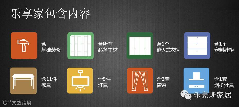 乐享家2.0是目前市场上真正拎包入住的互联网家装产品,包装修+包主材+包家具+包灯具+包嵌入式衣柜+包定制化鞋柜+包窗帘+包厨电,打破了传统的伪一站式装修后还需购家具,购灯具,购窗帘的苦恼。