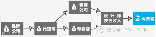 目前在家装行业,材料工厂和消费者之间有太多的中介(如下图)