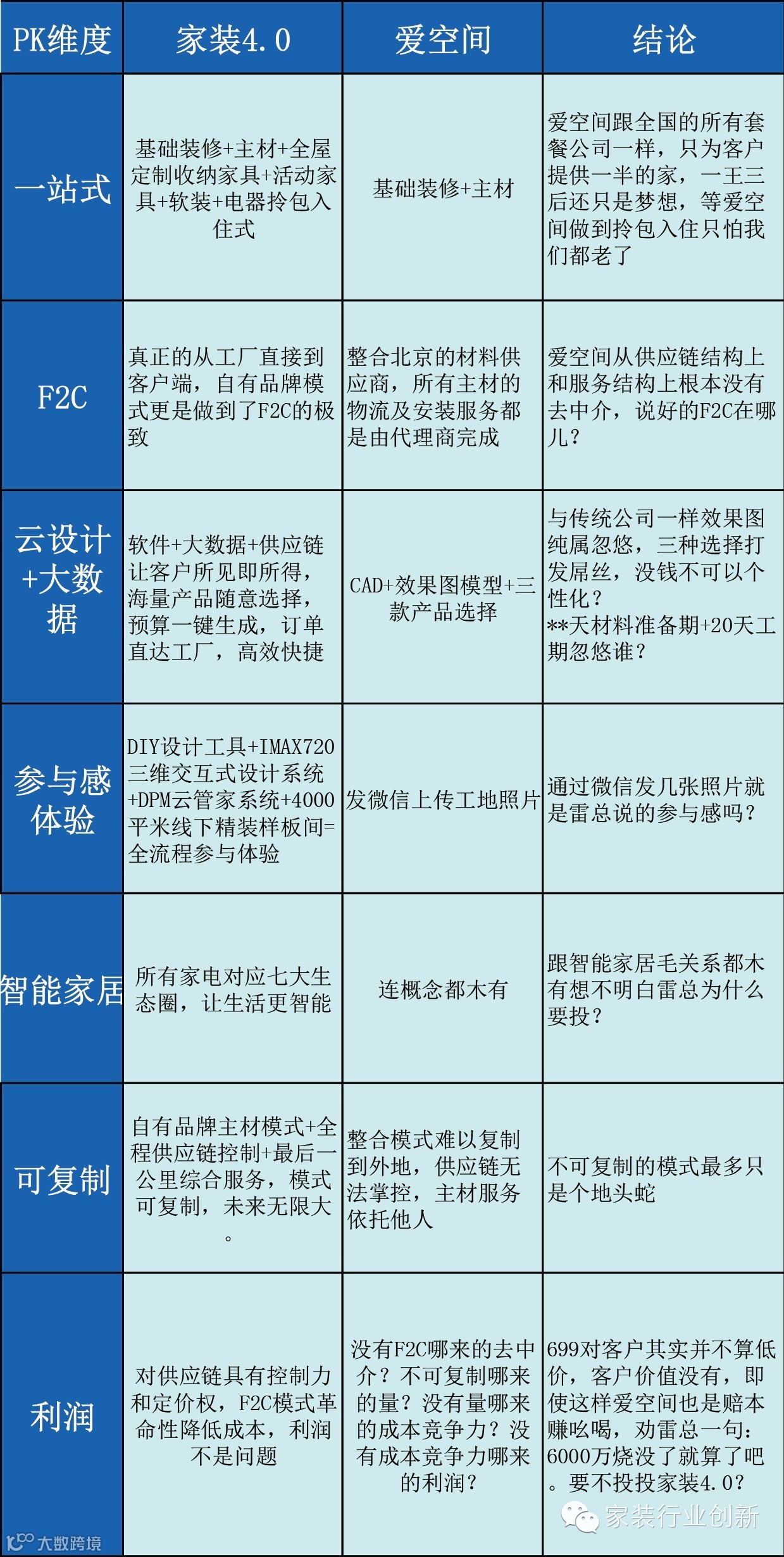 从以上分析可以看出,家装4.0无论是客户价值还是公司价值都秒杀爱空间。谁代表未来?谁是披着互联网外衣的传统套餐公司?相信大家一目了然!