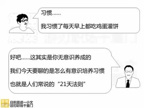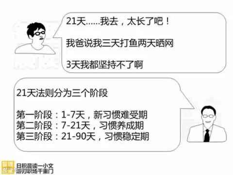 据研究,大脑构筑一条新的神经通道需要2l天时间。所以,人的行为暗示,经2l天以上的重复,会形成习惯,而90天以上的重复,会形成稳定的习惯。