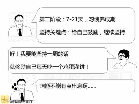 第二阶段:7—2l天,经过一周的刻意要求,你已经觉得比较自然、比较舒服了,但你不可大意,一不留神,你的坏情绪、坏毛病还会再来破坏你,让你回到从前。所以,你还要刻意提醒自己,要求自己。